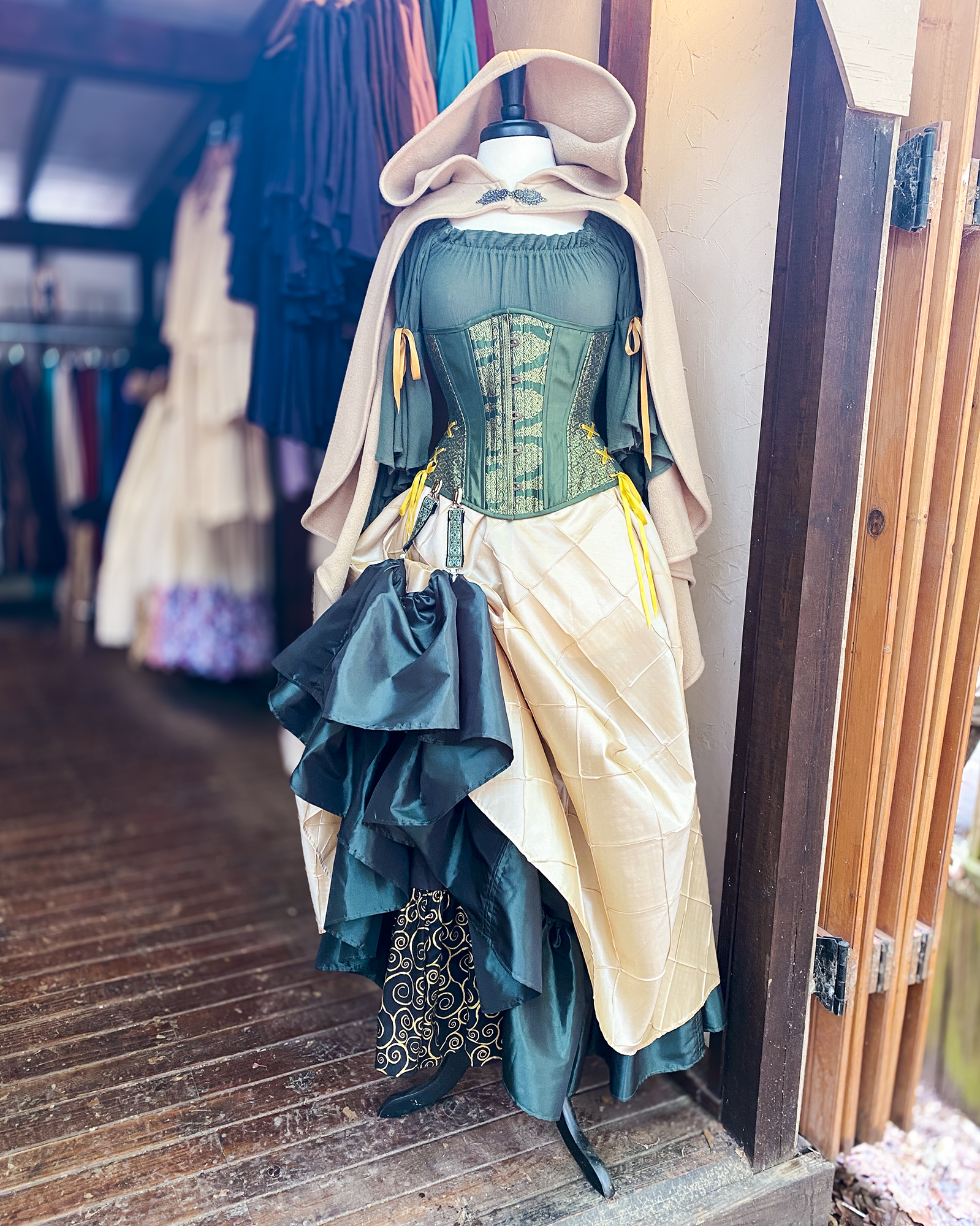 The Green and Gold Brocade Underbust Hourglass Corset can go with Renaissance, Pirate, and Steampunk costuming as well as everyday wear. Wear with a chemise, long skirt, and pixie skirt for a Renaissance faire outfit; layer over a dress for a Medieval or Fantasy look; wear with a shirt and layered pixie skirts for an Elven style; or wear with a high-collared shirt and bustle skirt for a Steampunk look!