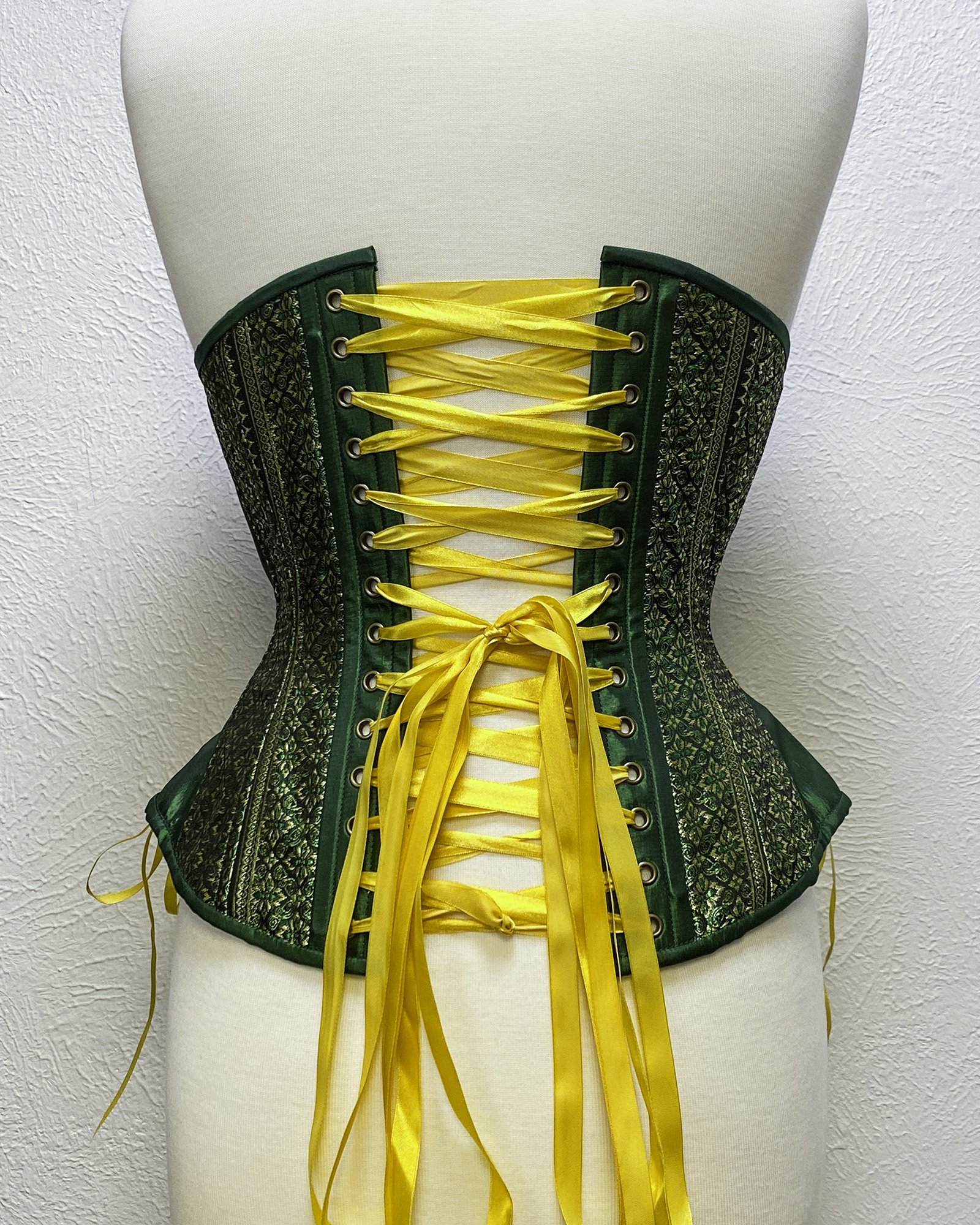 Green taffeta panels alternate with a traditional Thai brocade of green and gold. In the back and at the hips, this corset is laced with coordinating yellow satin ribbons. This corset is comfortable and supportive, with 20 flexible spiral steel bones, a steel busk with two flat steel stays for extra front support, and four flat steel stays to support the back grommets. Constructed with three layers of fabric: two inner layers of sturdy cotton twill, waist tape, and the brocade and taffeta outer layer. There are four garter loops (no straps included) attached at the inside bottom seam. Hourglass underbust corsets have a rounder, more contoured underbust line than that of the classic underbust corsets.