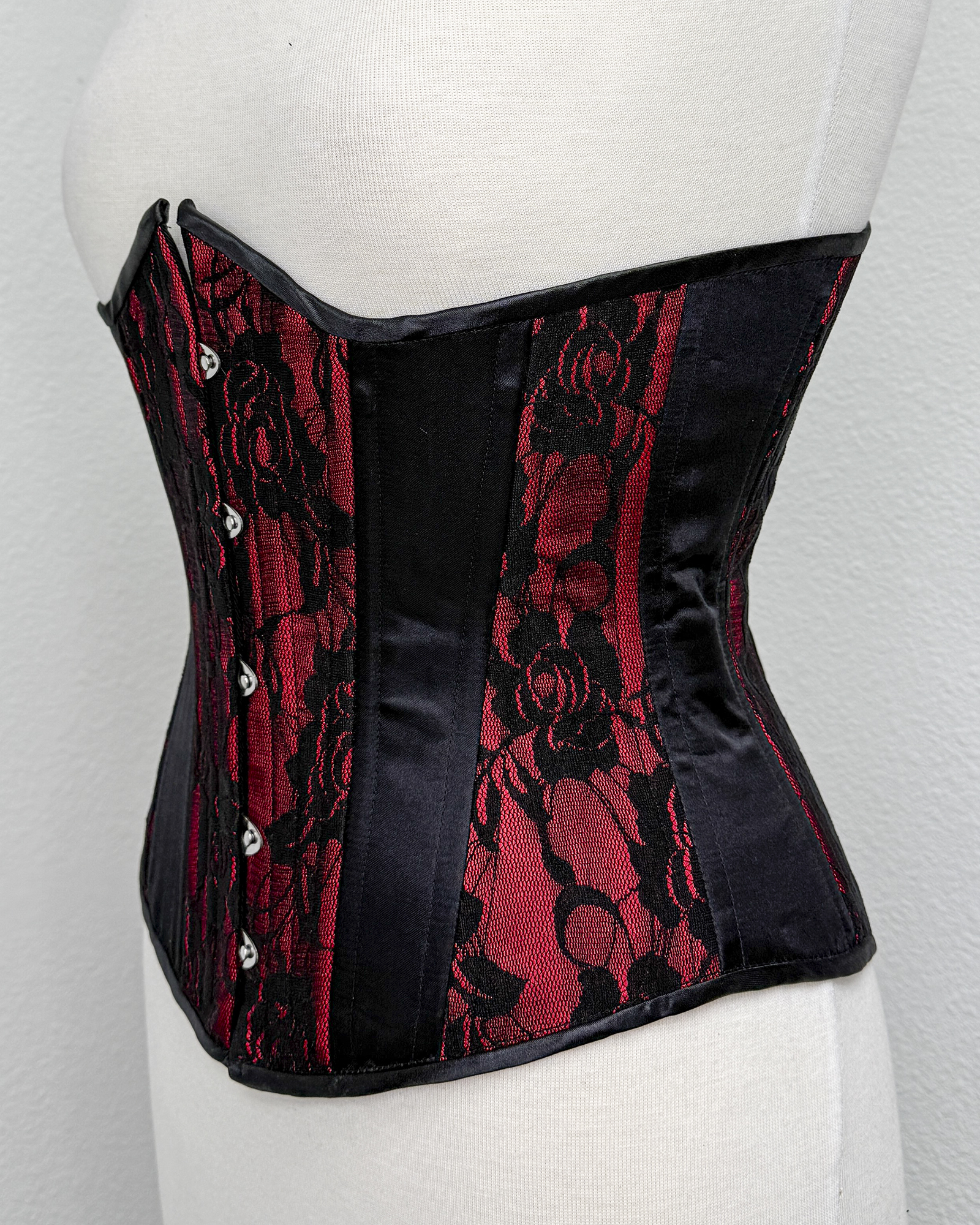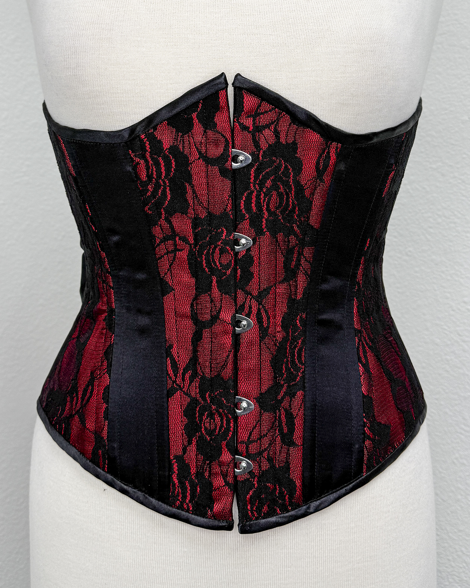 Red satin with black lace overlay alternates with solid black satin panels, and the corset is laced with black satin ribbon. This corset is comfortable and supportive, with 20 flexible spiral steel bones, a steel busk with two flat steel stays for extra front support, and four flat steel stays to support the back grommets. Constructed with three layers of fabric: two inner layers of sturdy cotton twill, waist tape, and the satin and lace outer layer. There are four garter loops (no straps included) attached at the inside bottom seam.