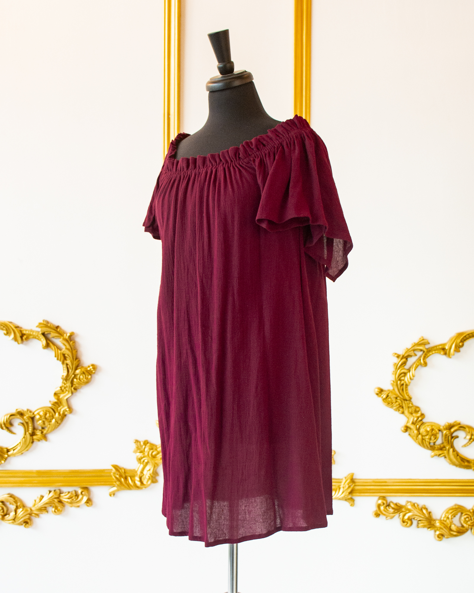 This Burgundy Flutter Sleeved Chemise is great for layering with corsets, skirts, belts, and sashes for your Renaissance, Pirate, or Steampunk wear. The elasticated neckline allows you to wear it over the shoulders or off the shoulders, and the sleeves are full, over-sized short sleeves that come to a point in back. The body of the chemise flares from the bust down to the hem.
