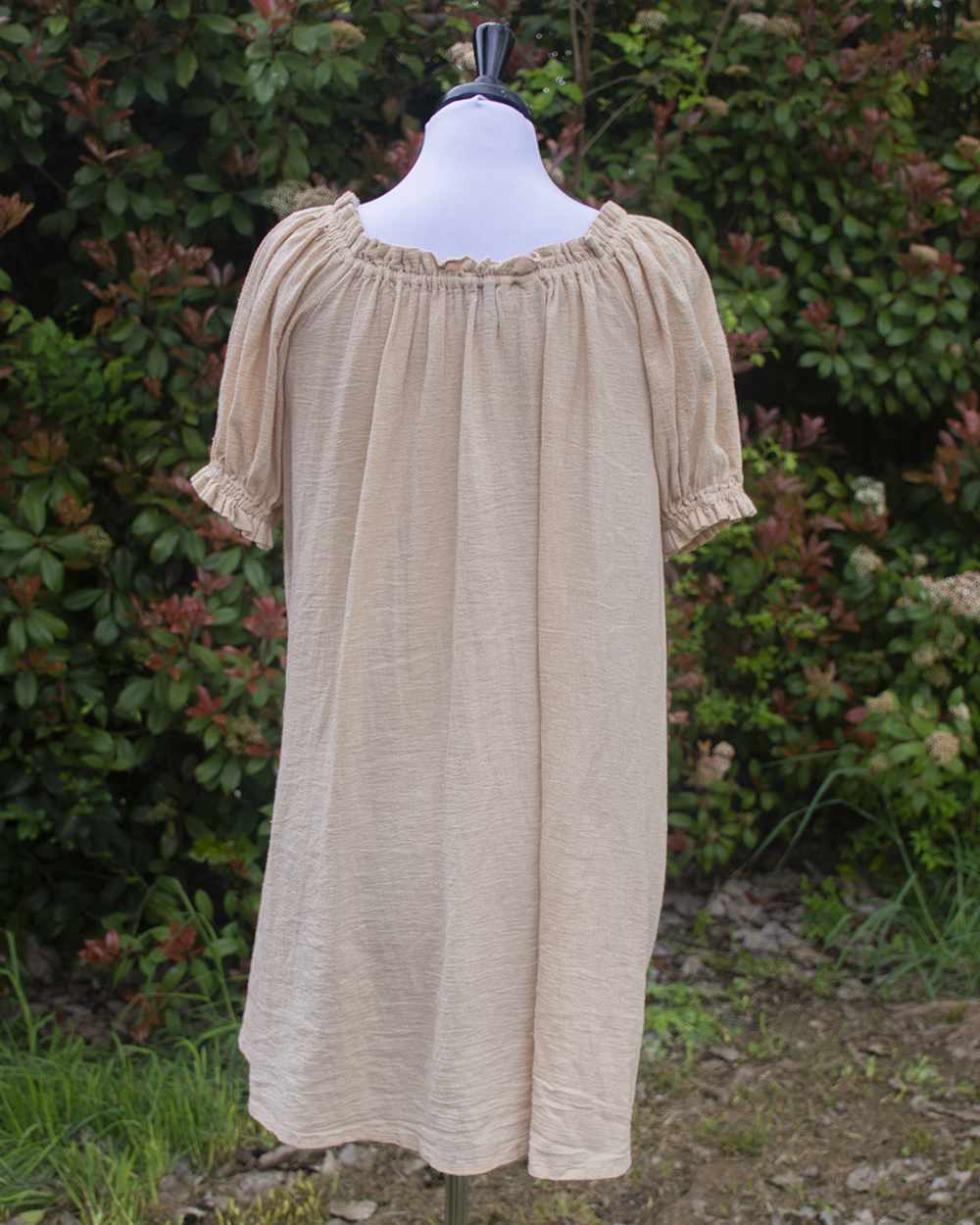 This champagne women’s short sleeved chemise is great for layering with corsets, skirts, belts, and sashes for your Renaissance, Pirate, or Steampunk wear. The elasticated neckline allows you to wear it over the shoulders or off the shoulders, and the sleeves are full, over-sized short sleeves. The body of the chemise flares from the bust down to the hem.