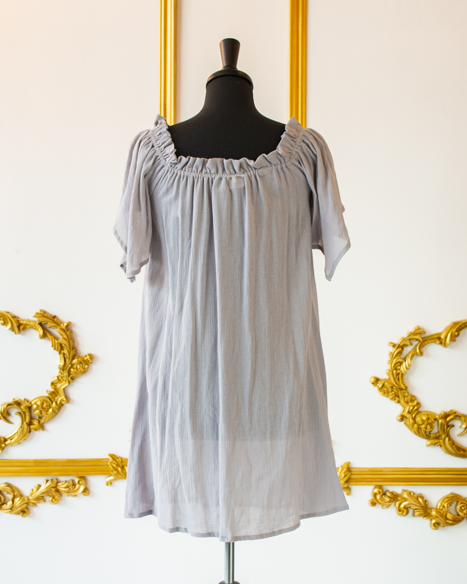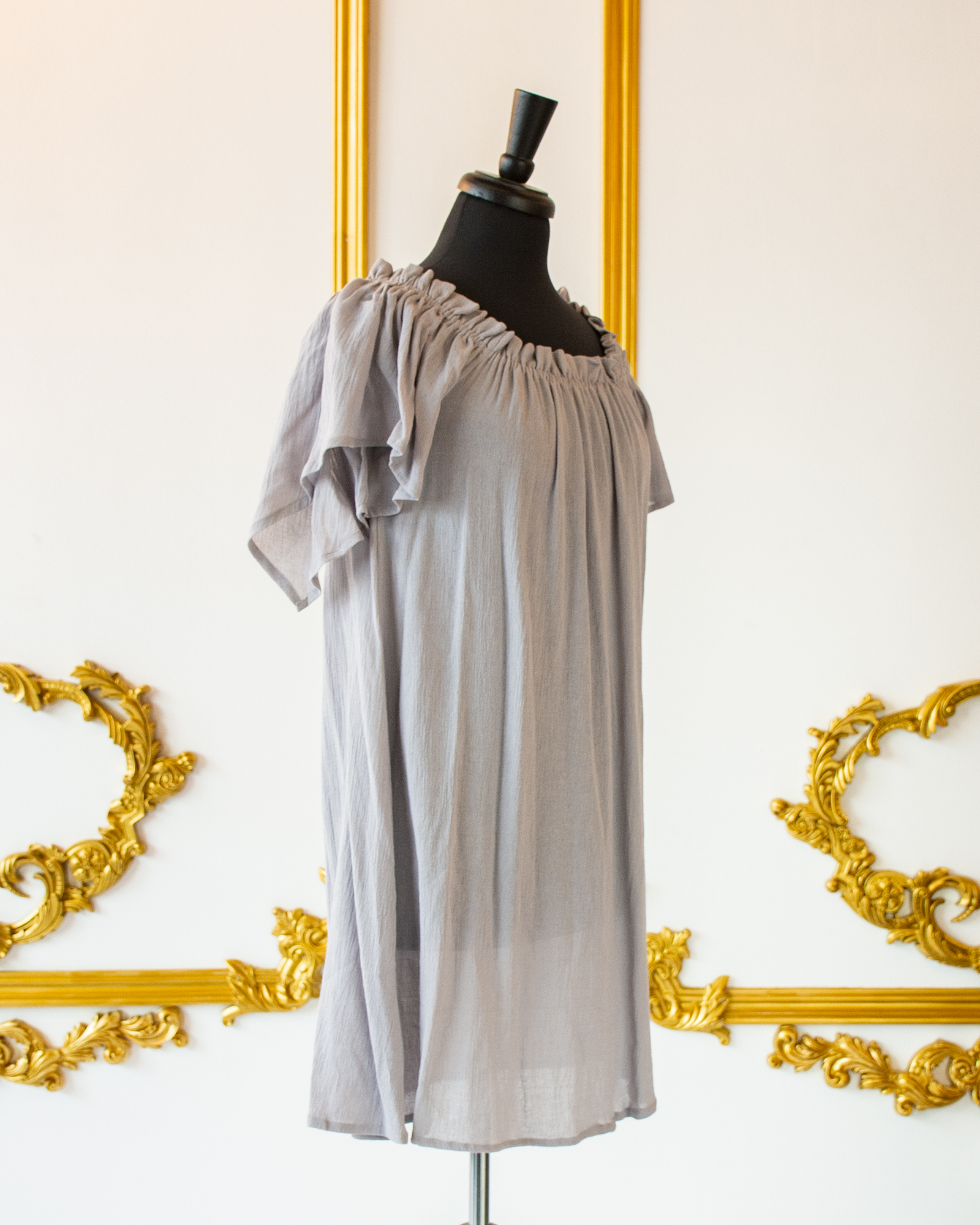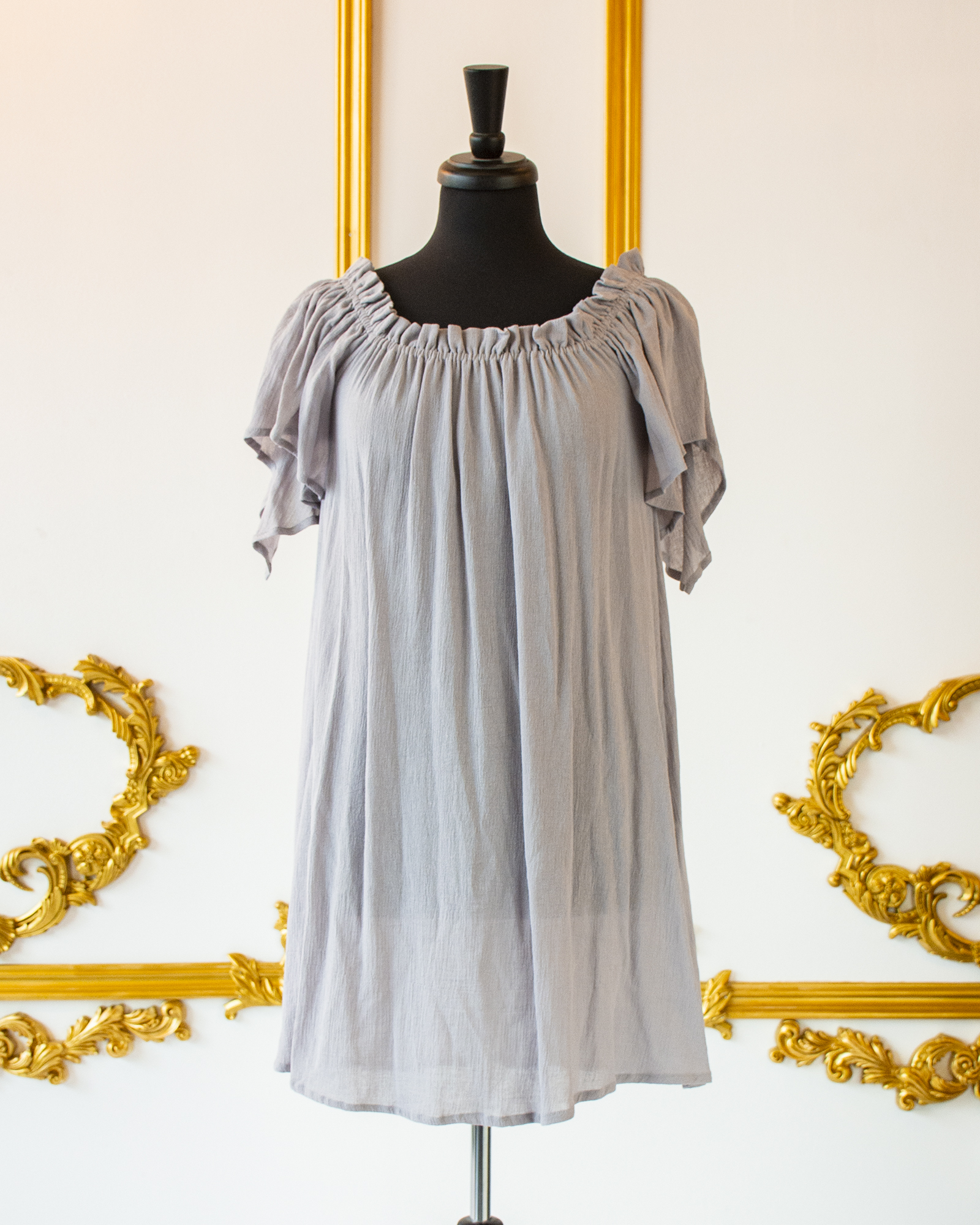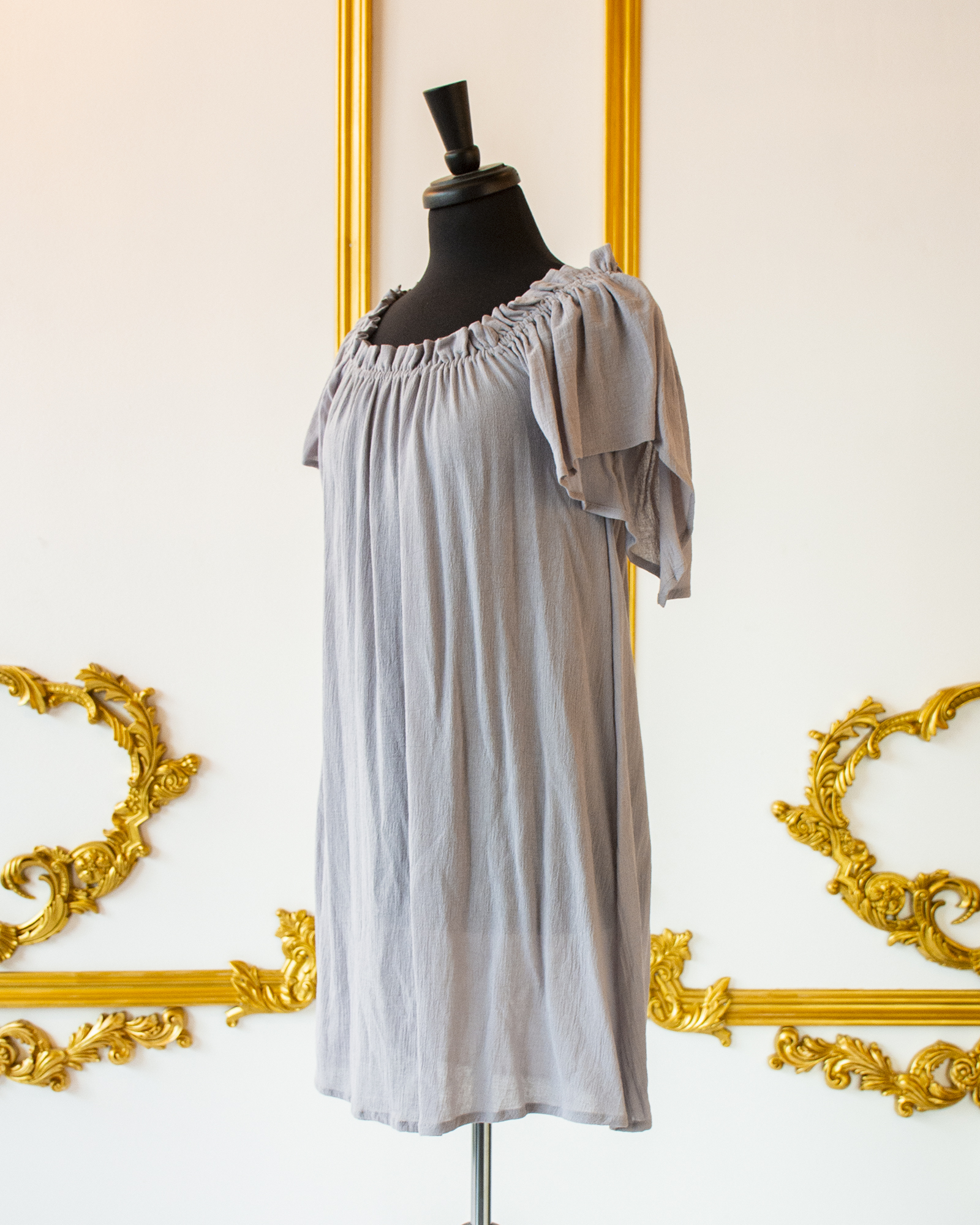 This Grey Flutter Sleeved Chemise is great for layering with corsets, skirts, belts, and sashes for your Renaissance, Pirate, or Steampunk wear. The elasticated neckline allows you to wear it over the shoulders or off the shoulders, and the sleeves are full, over-sized short sleeves that come to a point in back. The body of the chemise flares from the bust down to the hem.