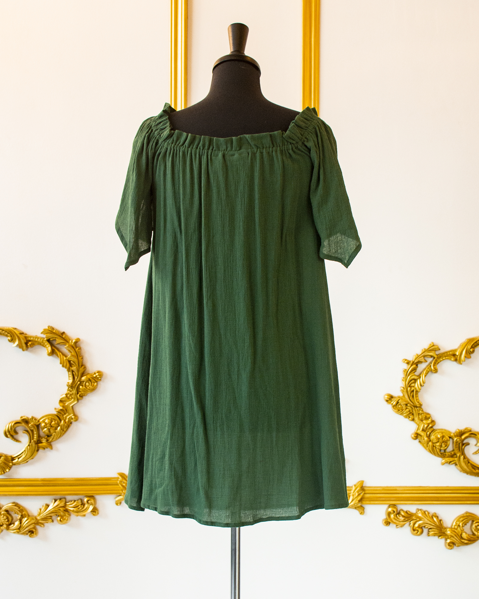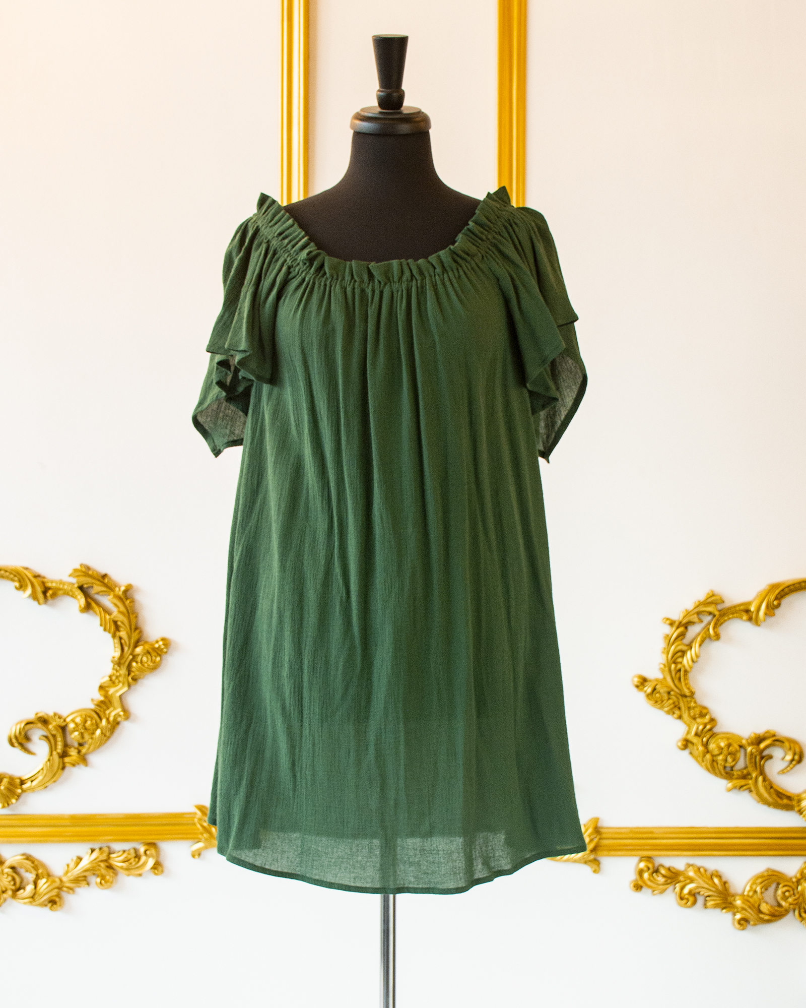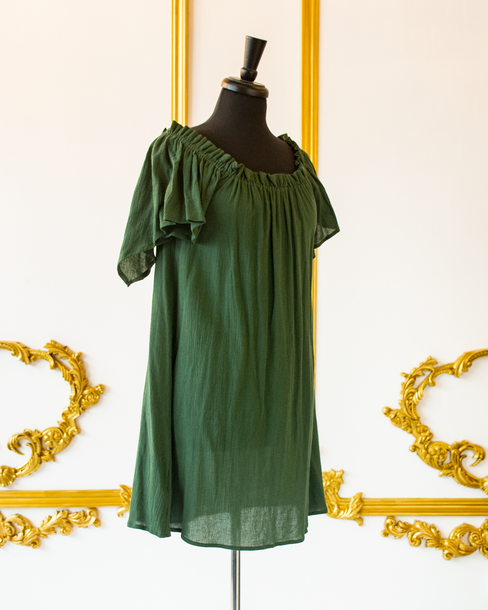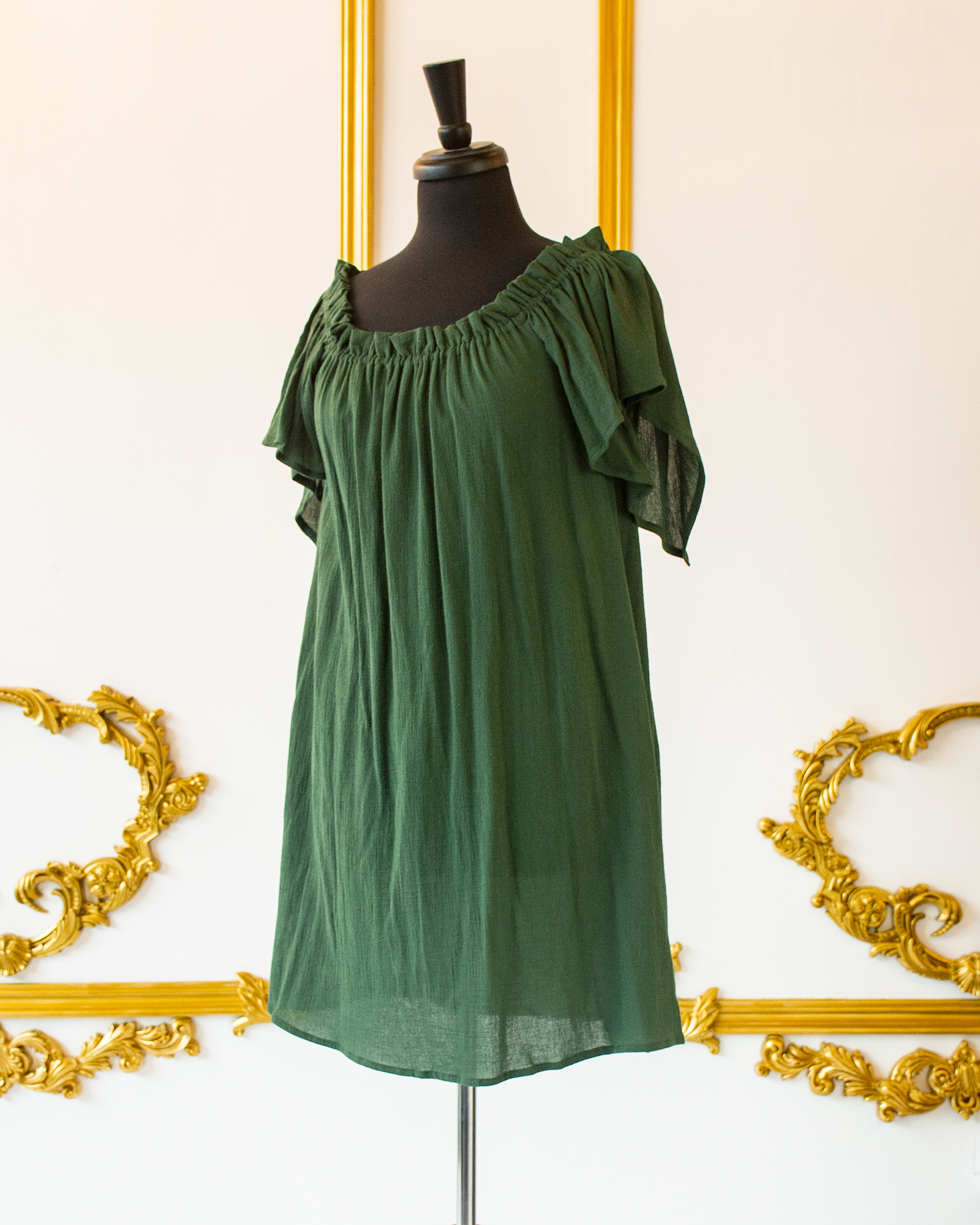 This Hunter Green Flutter Sleeved Chemise is great for layering with corsets, skirts, belts, and sashes for your Renaissance, Pirate, or Steampunk wear. The elasticated neckline allows you to wear it over the shoulders or off the shoulders, and the sleeves are full, over-sized short sleeves that come to a point in back. The body of the chemise flares from the bust down to the hem.