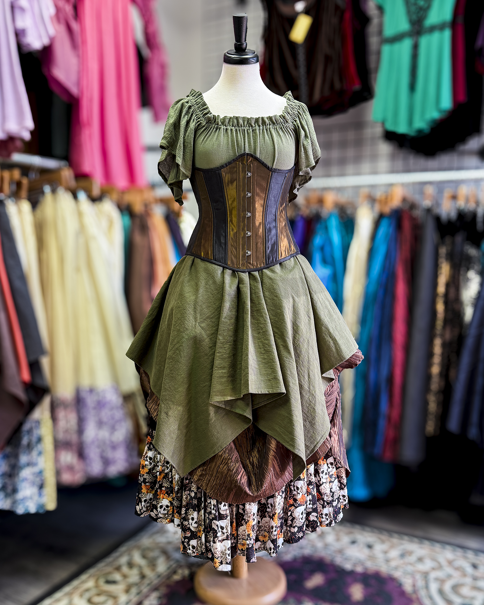 Shown styled with the Olive Green Flutter Sleeve Chemise, Brown and Black Taffeta Corset, Brown Crinkle Taffeta Renaissance Skirt, and Orange Floral Skulls Cotton Petticoat, available separately.